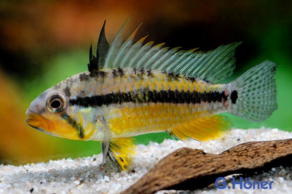 Charakteristisch für Apistogramma allpahuayo „black chin“ ist der orangefarbene Körper mit einer deutlich erkennbaren dunklen Kinnpartie. Ausgewachsen erreicht die Art eine Größe von 6-8 cm.