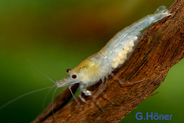 Charakteristisch für Neocaridina cf zhangijajiensis „white pearl“ ist der durchscheinende weiße Körper. Die Eier dieser Art sind ebenfalls weiß. Ausgewachsen wird die Art etwa 2-3 cm groß.