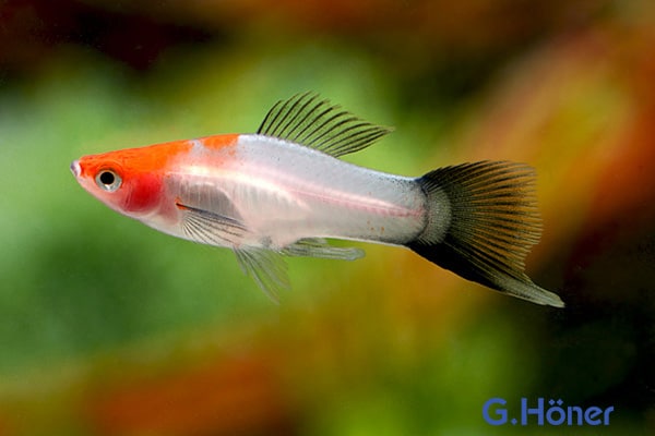 unten links: Xiphophorus hellerii – Schwertträger, Tancho-wagtail