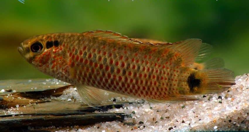 Bei Badis autumnum kann man aber immer gut drei Merkmale feststellen, egal wie das Tier sonst gefärbt ist: der breite Strich hinter dem Auge in Kombination mit dem Fehlen eines dunklen Punktes auf der Schulter (dem so genannten Cleithral-Fleck, der bei den meisten anderen Badis-Arten vorhanden ist) und der Schwanzwurzelfleck in Form eine liegenden T. Zusätzlich kann man bei den meisten Stimmungen einen schönen roten Punkt auf den meisten Schuppen der Flanke sehen, was den Fisch sehr attraktiv macht. Wie du auf dem einen Bild aber erkennen kannst, werden unterlegene Tiere fast schlagartig sehr hell, fast weiß. Es ist faszinierend, ein Aquarium mit Badis zu beobachten und zu versuchen aus den ständig wechselnden Farben die „Sprache der Fische“ zu entschlüsseln.