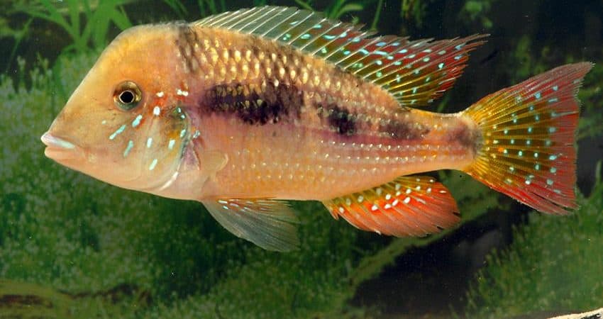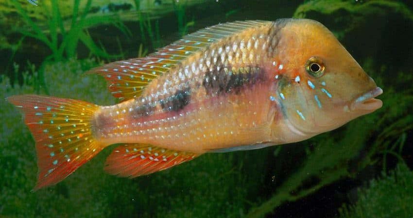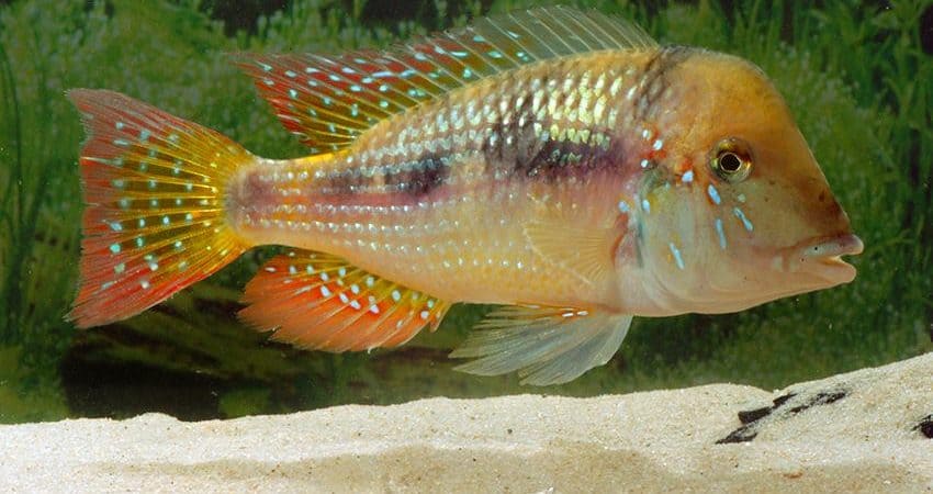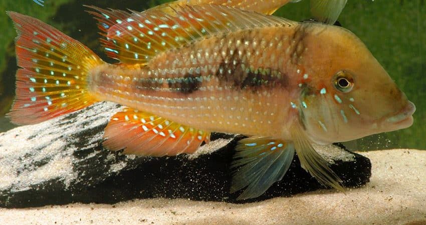 Glaser hat traumhaft schöne Wildfänge dieses Maulbrüters (das Weibchen bebrütet die Larven im Maul) aus Paraguay erhalten mit nur knapp 9 cm Standardlänge (mit Schwanzflosse also höchstens 12 cm) handelt es sich um eine der kleinsten Arten der Gattung.