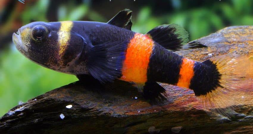 Dies ist die wohl schönste Art der Goldringelgrundeln, denn die Männchen entwickeln ein prächtiges Orangerot in der hinteren Körperhälfte. Die Weibchen sind meist gelb gefärbt, man erkennt sie aber auch ungeachtet der Färbung gut an dem vergleichsweise kleineren Kopf.