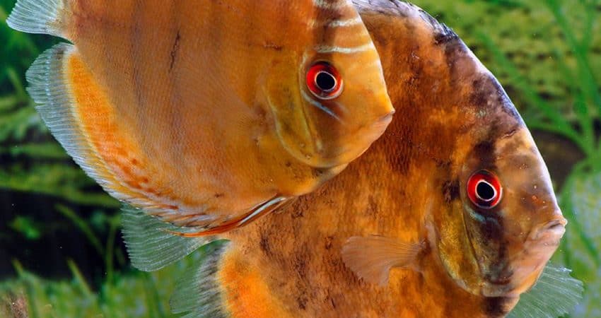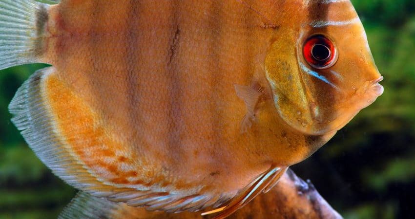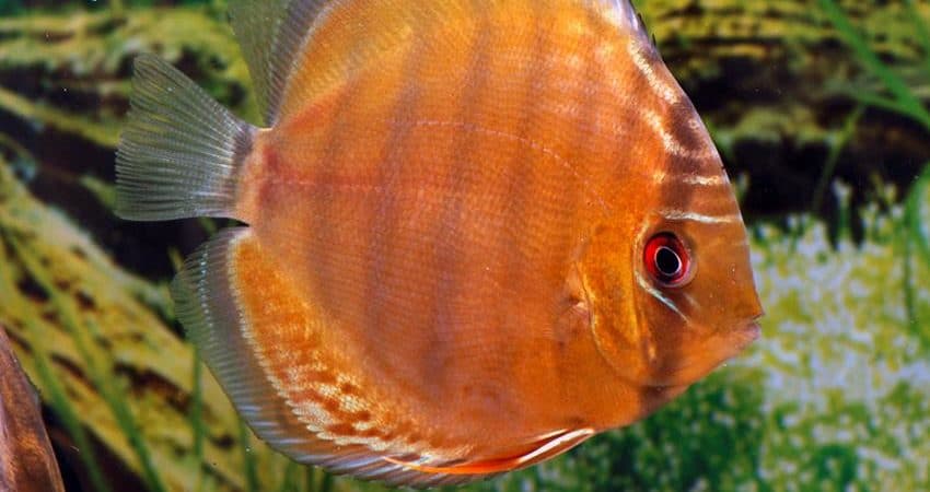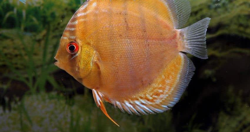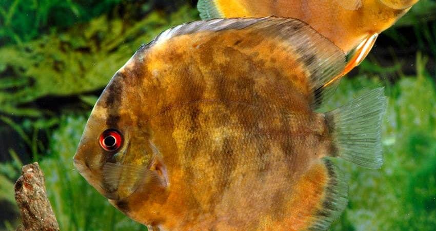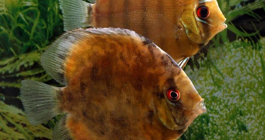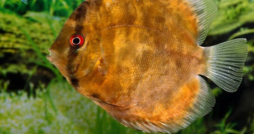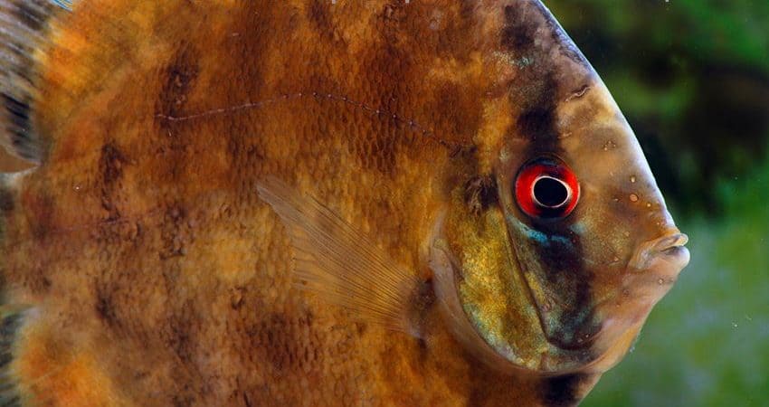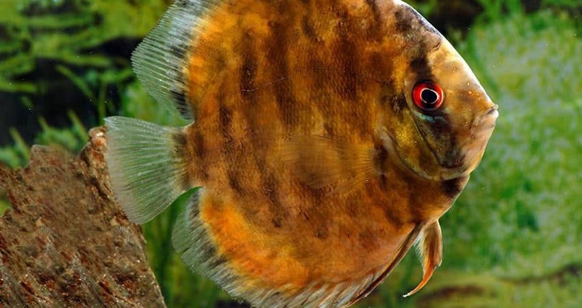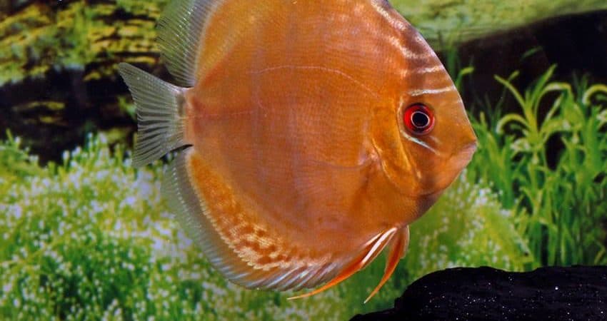 Vor einigen Wochen erhielt Aquarium Glaser über Manaus eine Sendung halbwüchsiger grüner Wildfangdiskus. Die Tiere gewöhnten sich gut ein. Als sie ihre Normalfärbung zeigten, stellte sich heraus, dass unter ihnen ein ganz ungewöhnlich gezeichnetes, scheckiges Exemplar ist. Zunächst dachten sie an eine Erkrankung, aber das Tier verhält sich völlig normal, frisst gut und interagiert mit seinen Artgenossen. Wenn es unter Stress gerät, wird es dunkel und es zeigt stimmungsabhängig auch die typischen senkrechten Streifen. Ist das Tier entspannt tendiert die Grundfärbung ins Orangefarbene. Es kann kaum einen Zweifel geben, dass wir es hier mit dem ersten uns je bekannt gewordenen „Orange Blotch“ (kurz: OB) Diskus zu tun haben.