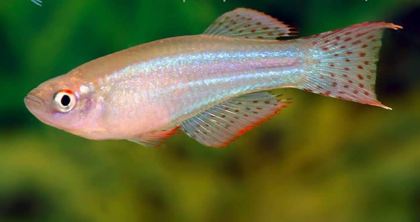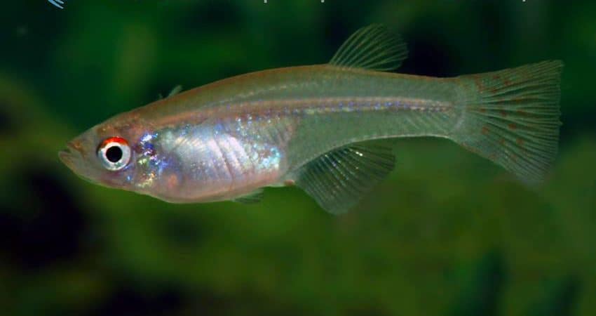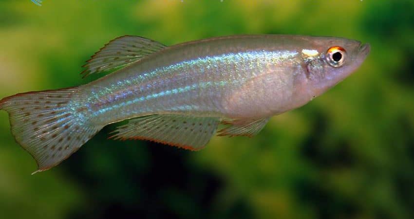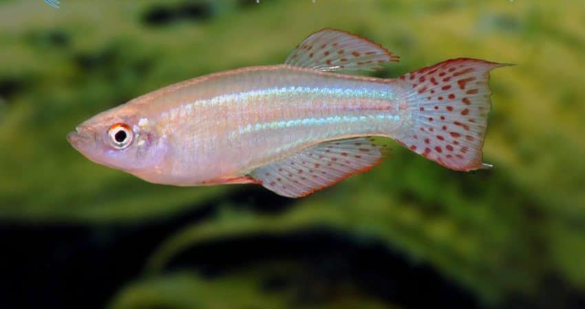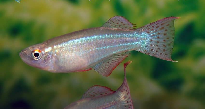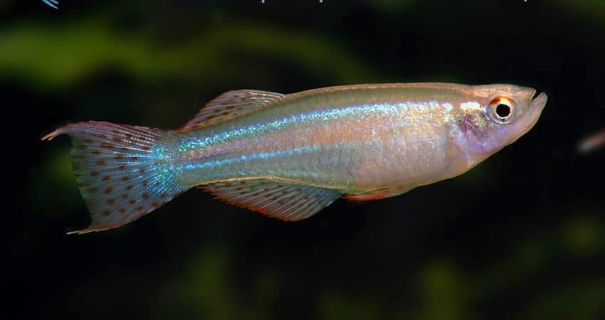 Aus Nigeria stammen diese herrlichen Procatopus aberrans. Diese Leuchtaugenfische sind sehr friedliche Schwarmfische, die die oberen Wasserschichten beleben. Im Gegensatz zu den meisten anderen Leuchtaugenfischen, die eine blaue Leucht-Zone in der Iris haben, haben P. aberrans eine kupferrote Leucht-Zone im Auge. Man kann das am besten sehen, wenn das Licht von oben in das Aquarium scheint. Überhaupt sollte man sich die Freude gönnen, Leuchtaugenfische in einem Aquarium zu pflegen, das gelegentlich Sonne erhält. Unter natürlichem Licht leuchten die türkisblauen Flanken und das kupferrote Auge, dass es eine Freude ist! Die Männchen werden deutlich größer als die Weibchen und haben eine lange Afterflosse.