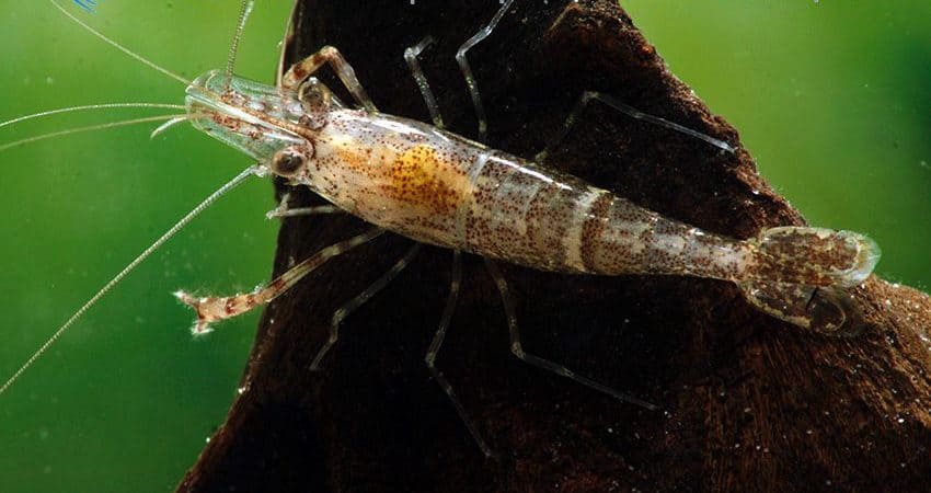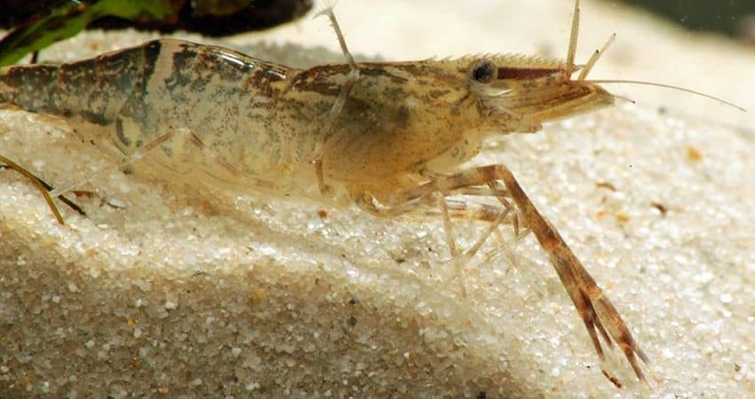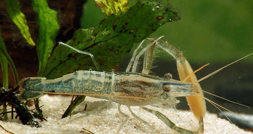 Diese sehr hübschen Chamäleon-Shrimps (Macrobrachium scabriculum) stammen aus Indien. Den deutschen Gebrauchsnamen prägte Uwe Werner, weil die Tiere im Laufe ihres Lebens ihre Grundfärbung ändern. Anfangs sind sie durchsichtig, dann werden sie gewöhnlich blau, dann braun und ganz alte Tiere sind fast schwarz. Nur der kontrastreiche Rückenstreifen bleibt immer erhalten. Die Männchen dieser im männlichen Geschlecht etwa 6,5 cm, im weiblich ca. 5 cm lang werdenden Art entwickeln an einem der beiden Scherenarme einen seltsamen Pelz. Die Eier sind bei dieser Art sehr klein, die Larven entsprechend winzig. Sie müssen in Meerwasser aufgezogen werden. Sobald sie als Garnele erkennbar sind, wandern sie ins Süßwasser ein, das sie zeitlebens nicht mehr verlassen.