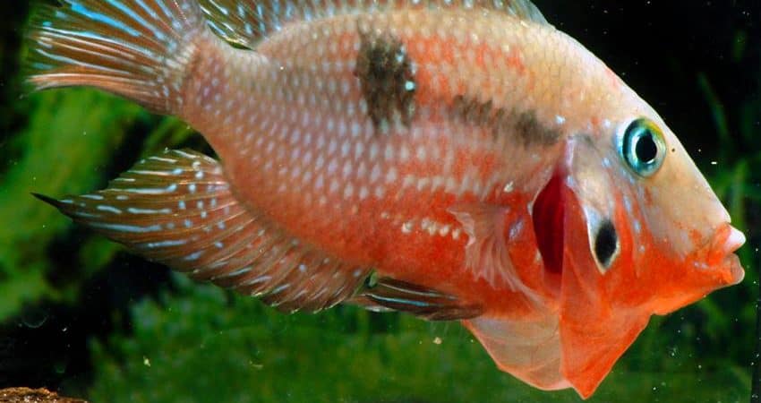 Der Feuermaulbuntbarsch (Thorichthys meeki, früher Cichlasoma meeki) stammt aus Mexiko und gehört zu den beliebtesten Buntbarschen überhaupt. Das verdankt er unter anderem seiner Gesichtsmaske. So eindrucksvoll wie der Meeki senkt keine andere Cichliden-Art den Mundboden und stellt dabei die tiefroten Kiemenhäute aus. Dadurch vergrößert sich der Meeki optisch enorm, denn einem Angreifer wird zusätzlich durch die Flecken auf den Kiemendeckeln (die Augen imitieren) vorgegaukelt, dass der Feuermaulbuntbarsch viel größer als in Wirklichkeit ist.