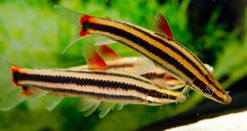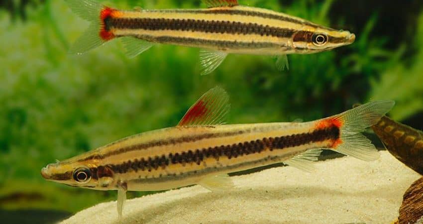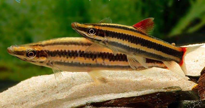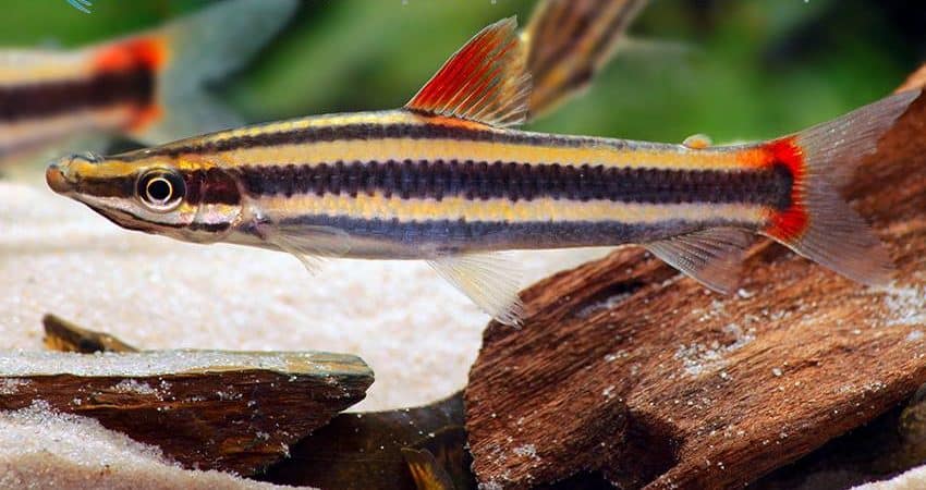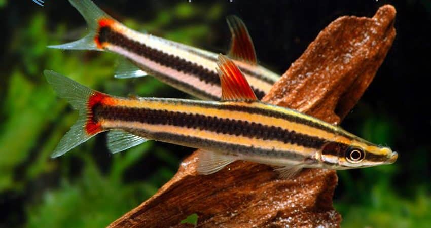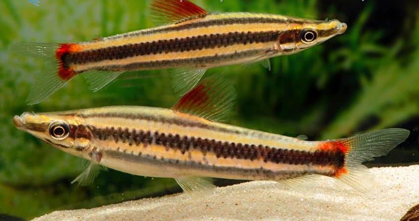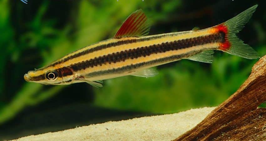 Der Prachtkopfsteher ist einer der schönsten Salmler Südamerikas. Er sieht aus wie der große Bruder des Dreibinden-Ziersalmlers, Nannostomus trifasciatus. Anostomus anostomus erreicht eine Länge von 15-18 cm. Leider erfolgen aus Guyana derzeit kaum noch Exporte von Zierfischen, weshalb der Prachtkopfsteher zu einem seltenen Gast im Aquarium geworden ist. Aber jetzt ist Glaser wieder einmal ein Import in guter Stückzahl gelungen. Die Tiere sind jung erwachsen und 9-12 cm lang. Und wie heißt es so schön im ersten Band des Aquarien-Atlas: Wer diesen Fisch noch nicht gepflegt hat, ist kein rechter Aquarianer! Dem ist nichts hinzuzufügen….