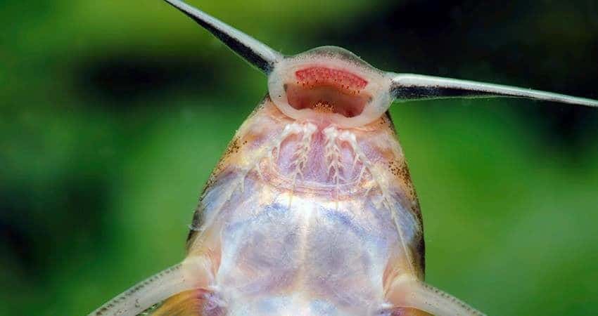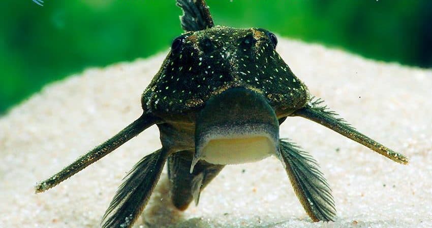 Aus dem Kongo hat Aquarium Glaser einen extrem selten angeboteten Fiederbartwels erhalten: Synodontis soloni. Die Art wird (für Fiederbartwels-Verhältnisse) mittelgroß: 20-25 cm lange Tiere können als kapitale Burschen gelten. Die große Schwanzflosse und der schlanke Körper deuten auf strömungsliebende Fische. Untereinander sind unsere 12-15 cm langen Tiere gut verträglich. Offenbar lieben S. soloni die Dunkelheit, denn ihre Augen haben eine extrem stark reflektierende Schicht, was bei den Biltzlichtaufnahmen zu seltsamen Ergebnissen führt. Glaser zeigt uns ein Portrait, bei sie das nicht nachträglich korrigiert haben. Bei den anderen Bildern haben sie diesen „Rote-Augen-Effet“ aber entfernt, damit die Tiere auf dem Foto so aussehen, wie man sie auch mit bloßem Auge wahrnimmt.