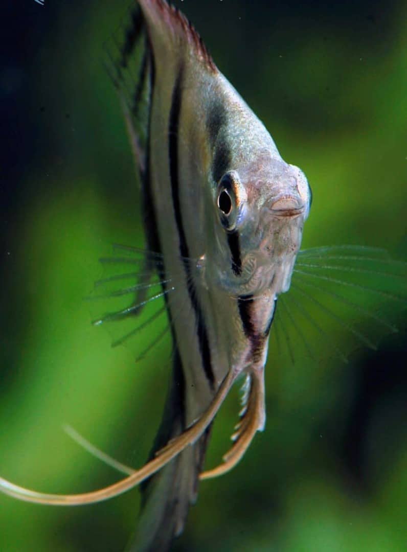 Das wirklich faszinierende an den Tieren ist der extreme Farbwechsel, zu denen sie fähig sind. Bereits die rund 5-7 cm langen, gerade geschlechtsreifen Jungtiere zeigen das. Diese Nachzuchten stammen von Elterntiere eines Züchters aus dem Taunus. Sie laichten ca. 700 bernsteinfarbene Eier auf einem Seemandelblatt ab. Dieses wurde jeweils dorthin gebracht, wo das Gelege am sichersten war. Bei der Balz und bei der Brutpflege zeigen die Eltern die verschiedensten Farbmuster. Sie können hellbeige bis rußschwarz sein, Längsstreifen, Vertikalbänder oder/und Punkte aufweisen – je nach Stimmung bzw. Informationszweck. Dieser wird auch durch die Körperhaltung zum Ausdruck gebracht. Dabei begegnen sich die Tiere in Schräglage, leicht auf die Seite kippend oder bei der Balz durch ein fast senkrechtes Aufstellen. Die Fische fressen Trockenfutter, gerne aber Mückenlarven und Würmer.