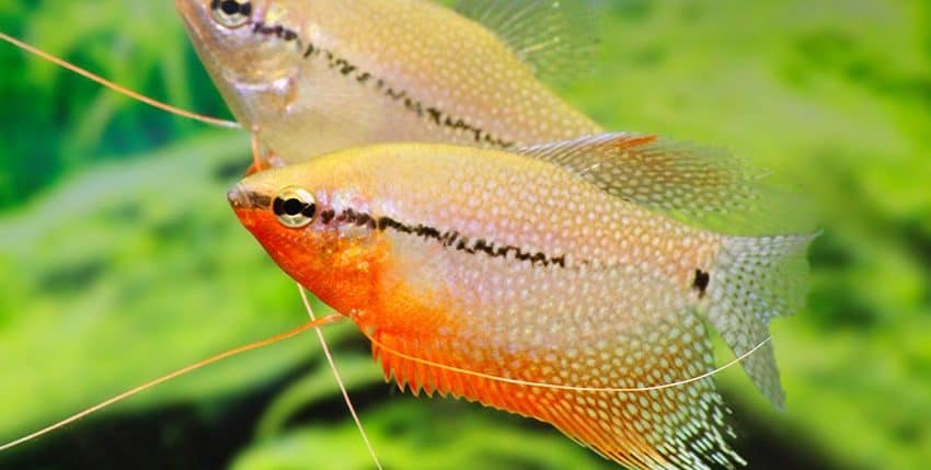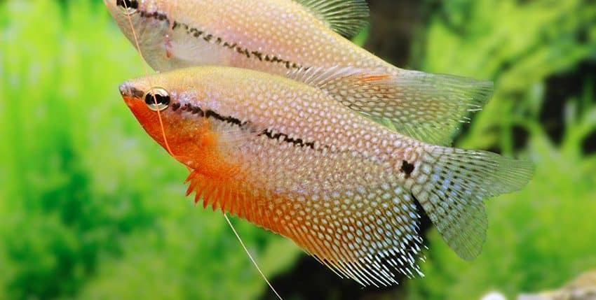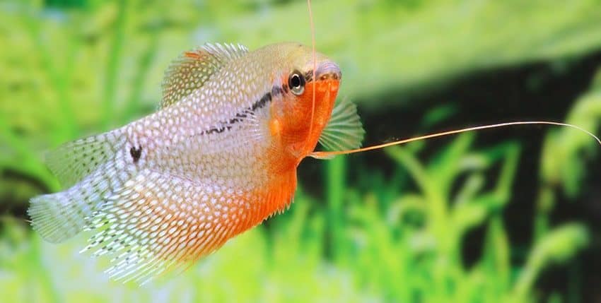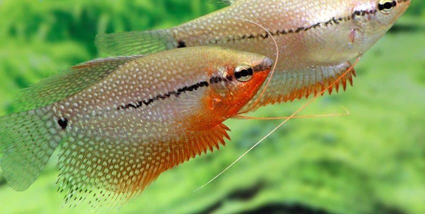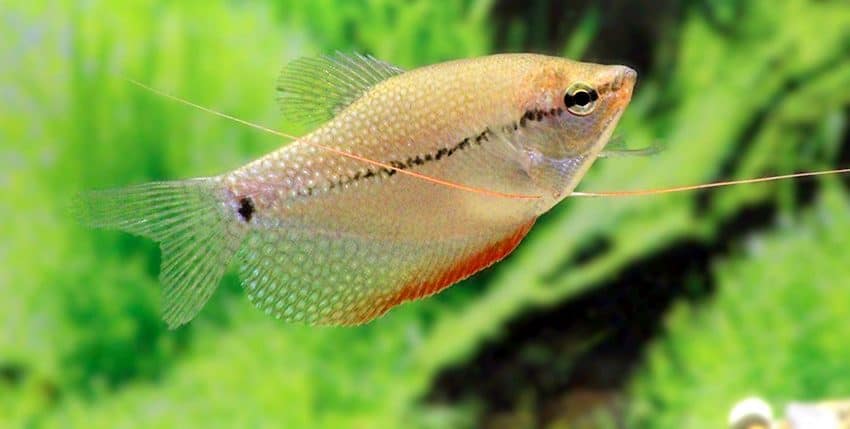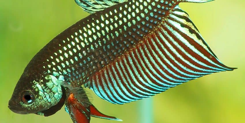 Der Mosaikfadenfisch (Trichogaster leerii) ist ein absoluter Klassiker unter den Aquarienfischen. Er ist immer und zu moderaten Preisen im Zoofachhandel vertreten. Dabei handelt es sich um Nachzuchtexemplare. Wildfänge werden de facto nicht gehandelt; in der Natur gilt die Art aufgrund der großflächigen Zerstörung ihres Lebensraumes als gefährdet. Leider leidet die Qualität der Tiere gelegentlich unter dem niedrigen Preis, die der Züchter für die Tiere erzielen kann; Die Fotos zeigen ganz wundervolle, voll ausgefärbte Exemplare aus heimischer Nachzucht.