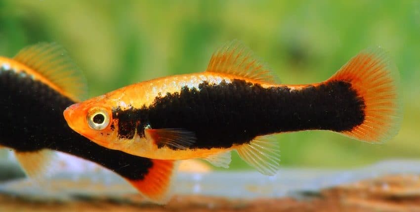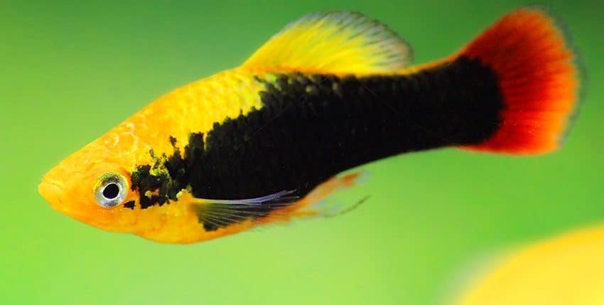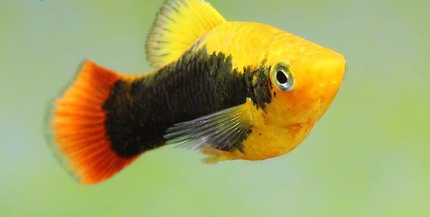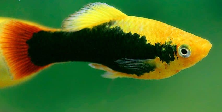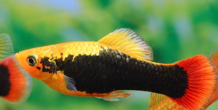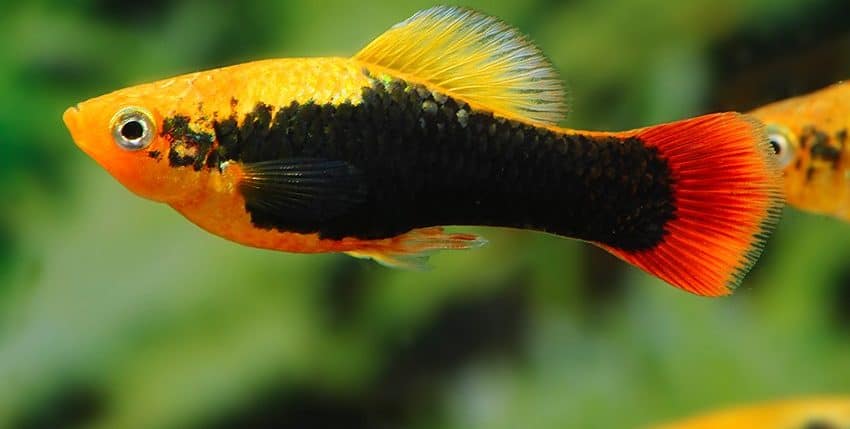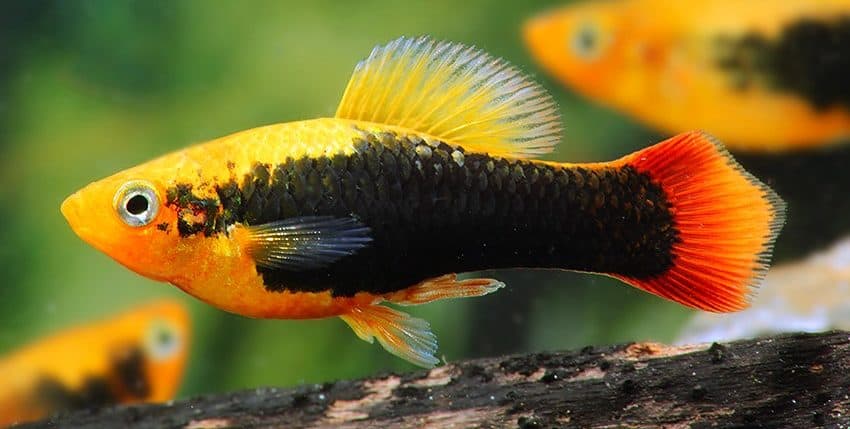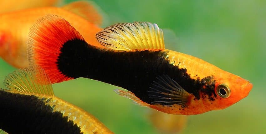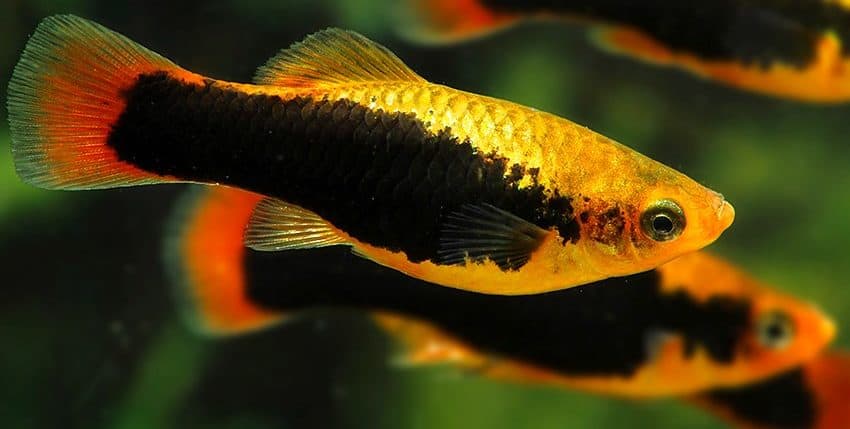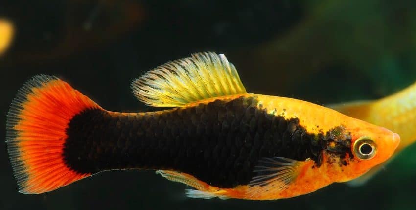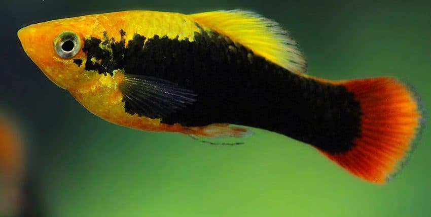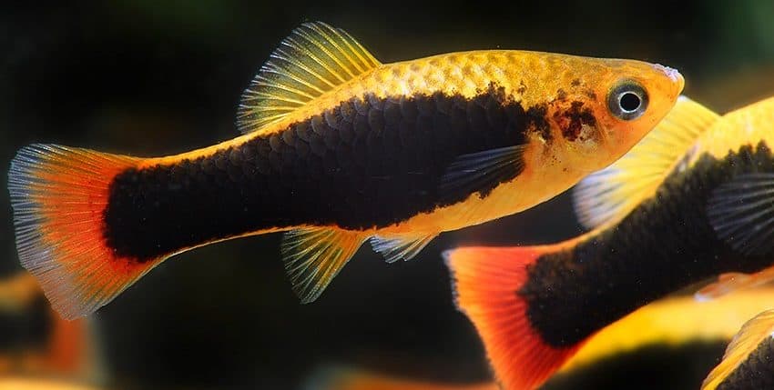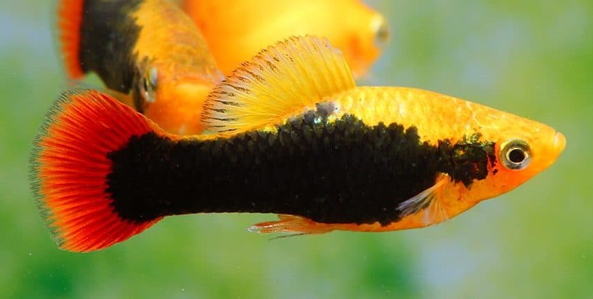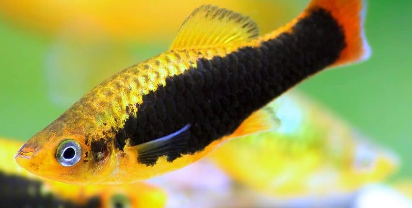 Der Papageienplaty (Xiphophorus variatus) ist im Hobby erheblich seltener vertreten als der Gewöhnliche Platy (X. maculatus). Es gibt auch viel weniger Zuchtvarianten des Papageienplatys. Eine dieser Zuchtvarianten ist allerdings unter den farblich schönsten Lebendgebärenden überhaupt einzurdnen, nämlich der Hawaii-Platy. Er ist im Prinzip die „Tuxedo“-Form des X. variatus. Gute Hawaii-Platys haben eine tiefrote Schwanzflosse, ein breites, schwarzes „Tuxedo“-Band (der Tuxedo ist ein schwarzer Anzug, den man im deutschen Sprachraum als Smoking bezeichnet) und eine goldgelbe Körperfarbe.