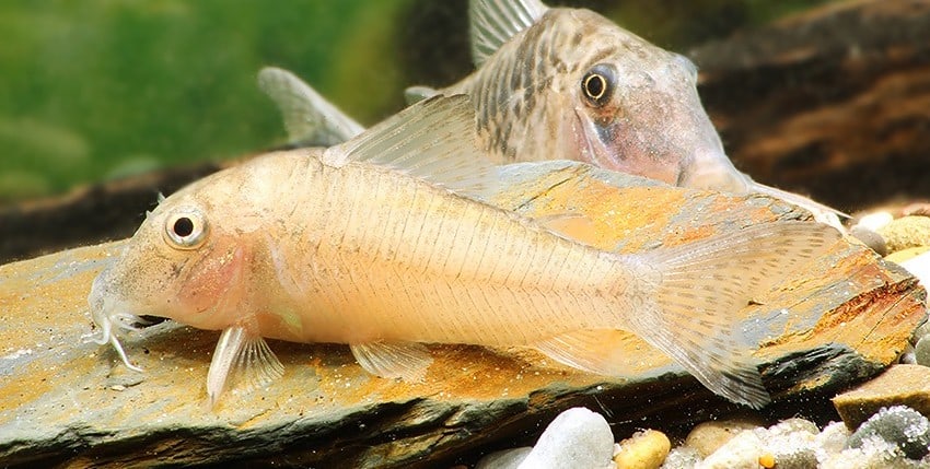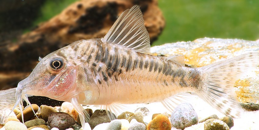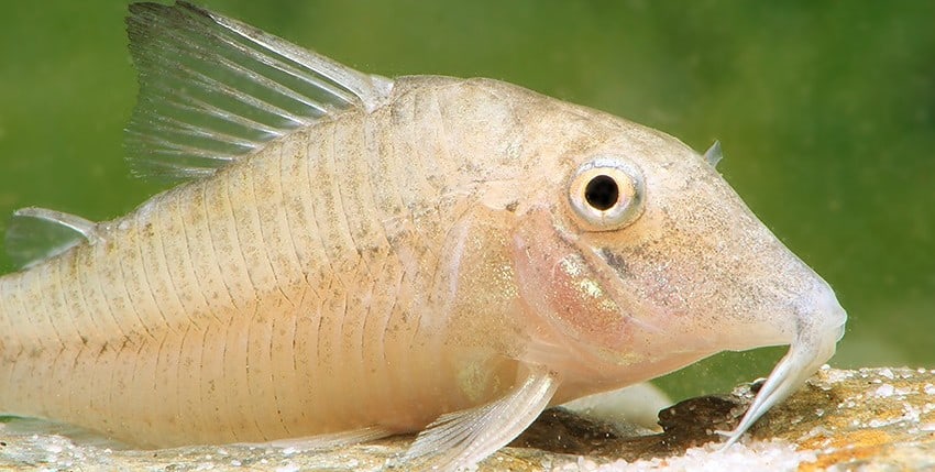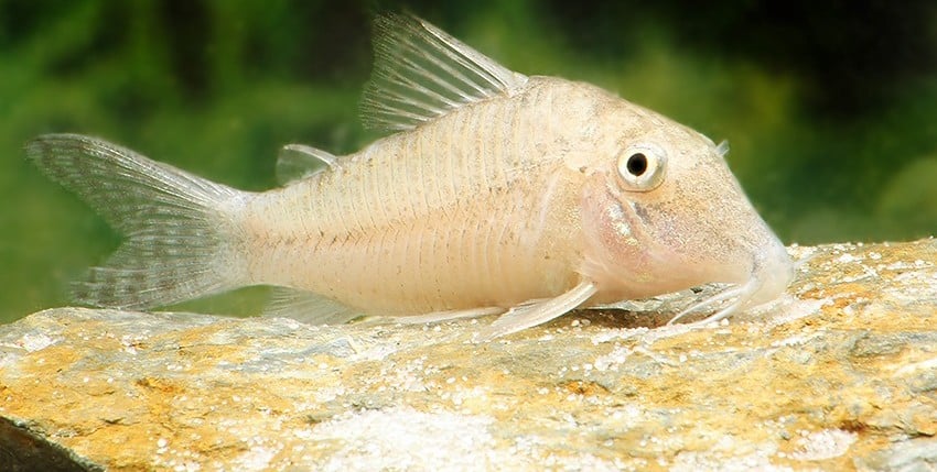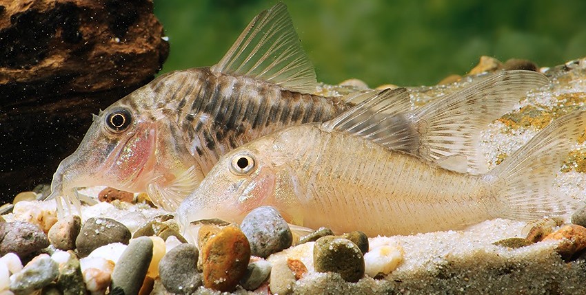 Den seltenen Langschnäuzer Corydoras sp. C124 kommt gelegentlich unter den Bezeichnungen C. cortesi (das ist eine andere Art aus Kolumbien) oder Corydoras „Huangana“ (so bezeichnet man die wilden Schweine der Spezies Weißbartpekari) aus Peru nach Deutschland. C124 ist sehr variabel gezeichnet, jedes Individuum ist an seinem speziellen Zeichnungsmuster zu erkennen. Aber diesmal ist etwas ganz Besonderes bei Glasers Lieferung dabei: ein fast völlig weißes Exemplar! Es handelt sich nicht um einen Albino; in der Nahaufnahme erkennt man, dass schwarze Pigmentzellen (Melanophoren) durchaus vorhanden sind, zudem ist die Pupille schwarz. Es handelt sich einfach um eine Laune der Natur. Der Weißling erkennt normal gefärbte C124 als Artgenossen und sucht ihre Gesellschaft, besonders wenn er beunruhigt ist.