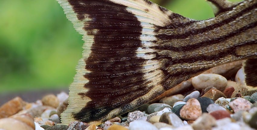 Alle bisher von Glaser importierten Exemplare stimmten – unabhängig von der Größe, wobei wir noch nie Tiere unter ca. 14 cm und über ca. 25 cm Länge erhalten haben – farblich überein. Aber alle 6 Exemplare des aktuellen Imports bei Aquarium Glaser(sie sind 14-16 cm lang) haben eine zusätzliche weiß-gelbe Zone in der Schwanzflosse unmittelbar an deren Ansatz.