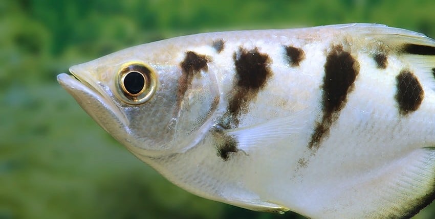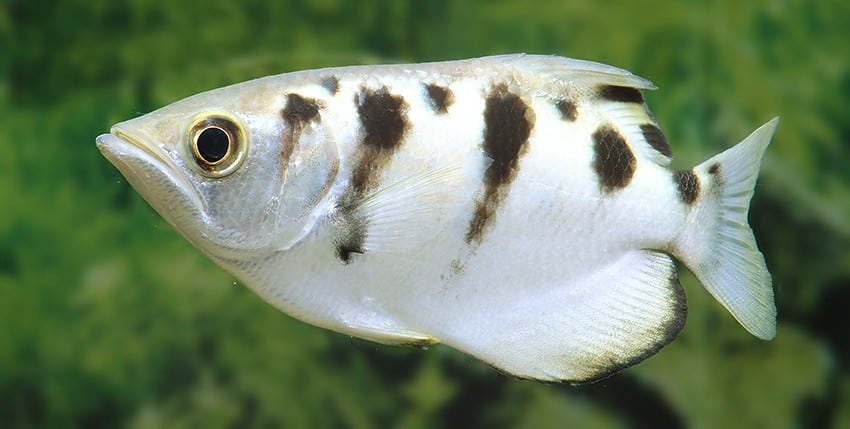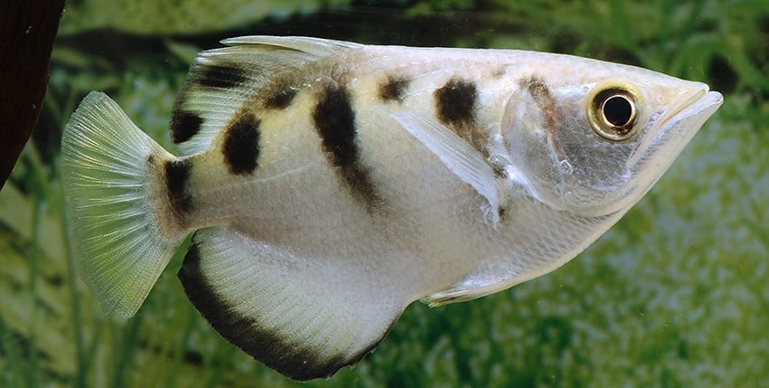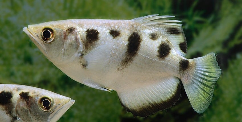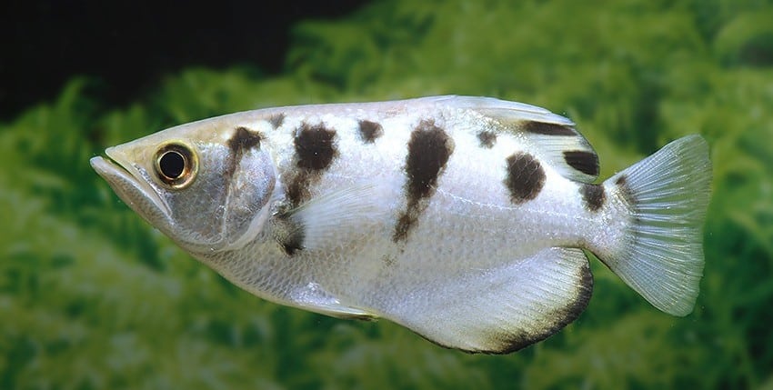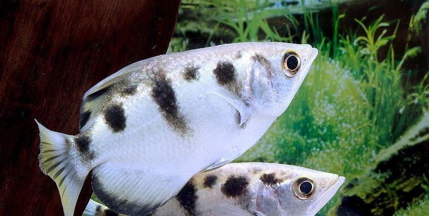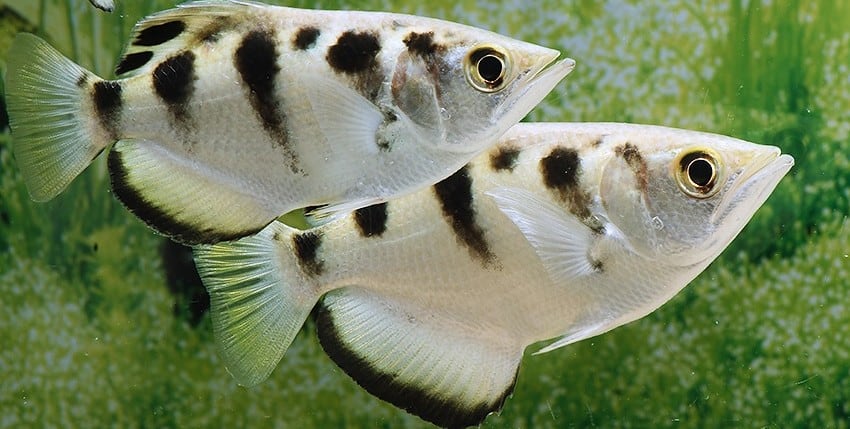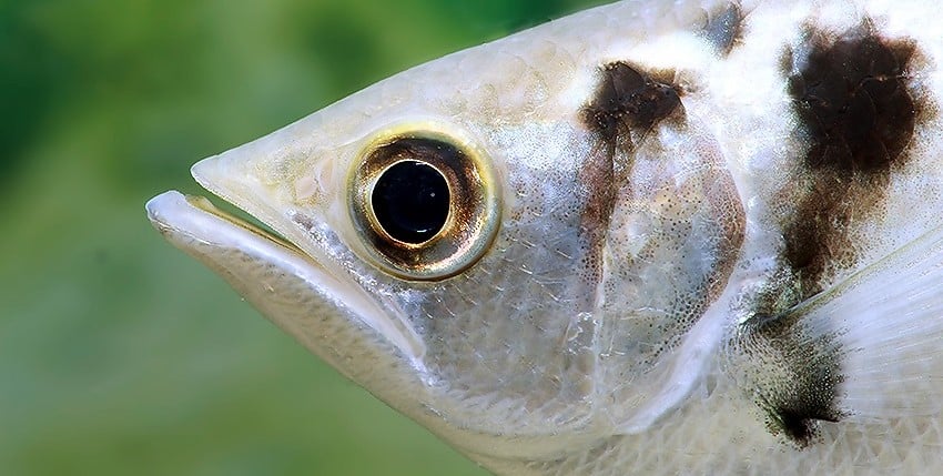 Die herrlichen T. chatareus, die Aquarium Glaser für diesen Post fotografiert haben, stammen aus Vietnam; genauere Informationen liegen Ihnen noch nicht vor. Sie fühlen sich aktuell in reinem Süßwasser sehr wohl; Unwohlsein drücken Toxotes durch eine Dunkelfärbung aus, sie können dann fast völlig schwarz erscheinen. Wichtig ist bei der Pflege von T. chatareus, den pH-Wert im Auge zu behalten, der nicht unter 7,5 fallen sollte, besser ist ein pH leicht über 8.
