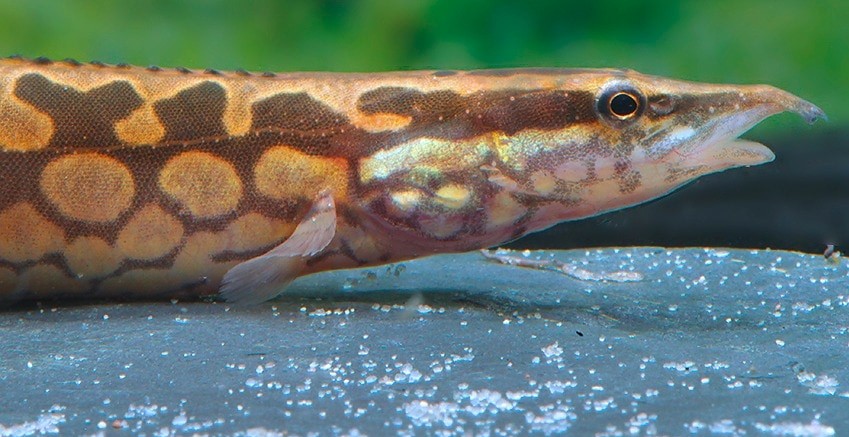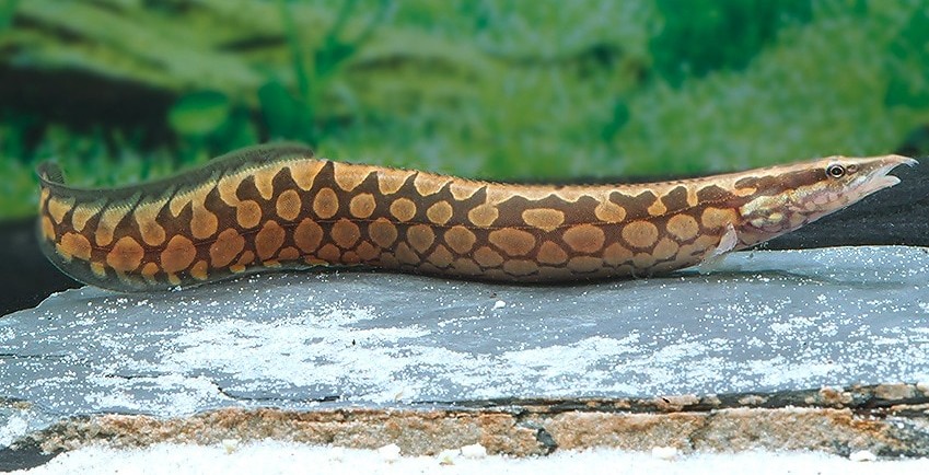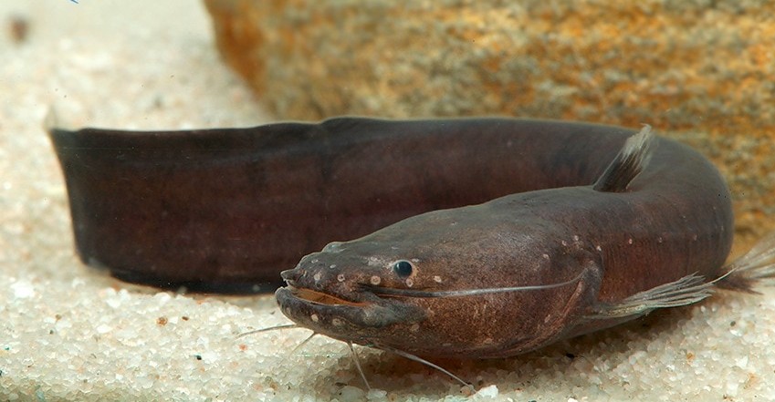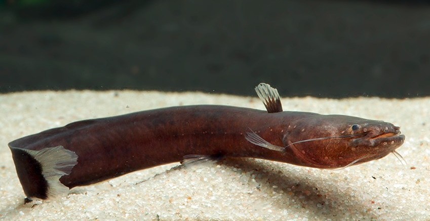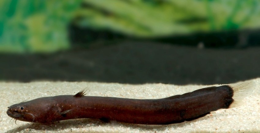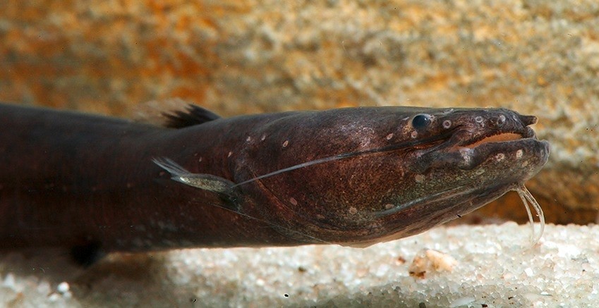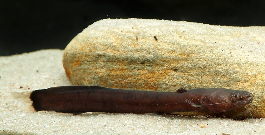 Dieser kleine, in seiner Merkmalskombination einzigartige Wels stammt aus Peru. Dort wurde er (wissenschaftlich) erstmals 1984 in einem kleinen Zufluss des Rio Nanay, der sandigen Boden – bedeckt von pflanzlichem Material (wohl Totholz, totem Laub etc) – gesammelt. Die wissenschaftliche Erstbeschreibung erfolgte dann 1999 als Myoglanis koepckei. Im Zierfischhandel wird diese Art nur ganz vereinzelt in kleinen Stückzahlen angeboten. Für Aquarium Glaser sind es die ersten Exemplare überhaupt, die sie importieren konnten. Das größte Exemplar, das bislang wissenschaftlich vermessen wurde, war 5,9 cm lang (ohne Schwanzflosse). Das für diesen Post fotografierte Tier ist ungefähr so groß, eher etwas größer und misst (mit Schwanzflosse) ca. 7,5 cm. Auffällig sind die zahlreichen und großen Poren im Kopfbereich und auf dem Vorderkörper, die seltsamerweise in der wissenschaftlichen Erstbeschreibung gar nicht erwähnt werden. Diese Poren sind hochempfindliche Sinnesorgane. Körperform und eben diese Poren (es handelt sich dabei um Elektrorezeptoren, mit denen extrem schwache elektrische Ströme wahrgenommen werden, wie sie z.B. bei der Muskelbewegung eines kleinen Wurmes entstehen) erinnern stark an die Verhältnisse bei Gymnallabes. Zwar sind Myoglanis und Gymnallabes nicht miteinander verwandt; sie führen aber wahrscheinlich eine ähnliche Lebensweise.