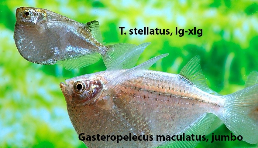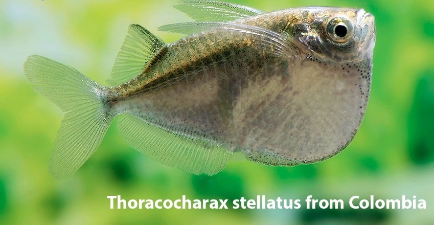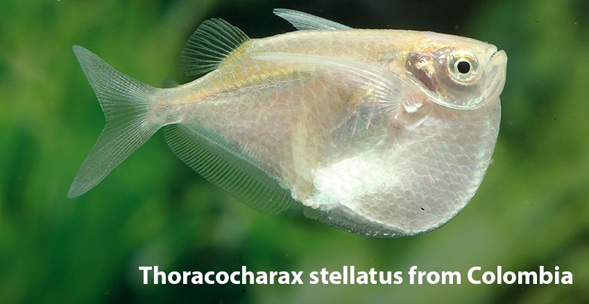 Der Platinbeilbauch, Thoracocharax stellatus, gehört zu den häufig importierten und dennoch geheimnisvollen Arten innerhalb der Beilbauchsalmler. Er scheint eine extrem weite Verbreitung in Südamerika zu haben. Wissenschaftliche Belege gibt es aus Argentinien, Bolivien, Brasilien, Kolumbien, Uruguay, Ekuador, Paraguay, Peru und Venezuela. Unabhängig von Staatsgrenzen sind das also die Fluss-Systeme von Paraguay/Paraná, Amazonas und Orinoko. Wir haben auch schon Exemplare aus vielen Ecken dieses gewaltigen Artareals erhalten. Optisch stimmen alle miteinander überein. Die Erfahrung lehrt jedoch, dass derart große Gebiete nicht von nur einer Art bewohnt werden, sondern es sich dabei in Wirklichkeit um mehrere Arten handelt. Und tatsächlich beschreibt Fagner de Souza 2014 in seiner Doktorarbeit zwei weitere Thoracocharax-Arten. Da Doktorarbeiten aber im wissenschaftlichen Sinne als „nicht publiziert“ gelten, sind diese beiden Arten bisher formal noch ohne Namen. Die eine kommt aus dem Apure und weiteren Orinoko-Zuflüssen in Venezuela, die andere aus den Einzügen der Flüsse Jurua und Purus in Brasilien. Thoracocharax stellatus stammen fast immer aus Kolumbien (Orinoko). Es gibt in Thoracocharax nur eine weitere wissenschaftlich akzeptierte Art, nämlich T. securis. Sie stellt ein weiteres Rätsel dar. T. securis stammt aus dem oberen Amazonas-Becken und kommt nach wissenschaftlichen Angaben auch oft gemeinsam mit T. stellatus vor, taucht jedoch praktisch nie in den Zierfischsendungen auf, selbst wenn man sie bestellt. Das ließ Glaser schon daran zweifeln, dass es diese Art überhaupt gibt. Aber es gibt sie, wir zeigen Ihnen hier auch eines der ganz wenigen existierenden Lebendfotos dieser Art. Sie unterscheidet sich von T. stellatus durch den erheblich stärker gewölbten Bauch, das Fehlen eines schwarzen Flecks an der Basis der Rückenflosse und – das ist das absolut zweifelsfreieste Erkennungsmerkmal – dadurch, dass T. stellatus nur zwei bis drei Schuppenreihen auf der Basis der Afterflosse hat. Dort besitzt T. securis 5-6 Schuppenreihen. Das dritte Rätsel der Platinbeilbäuche ist die Frage nach der erreichbaren Endgröße. Für T. stellatus werden in der wissenschaftlichen Literatur 6,7 cm Standardlänge (ohne Schwanzflosse), für T. securis 6,8 cm angegeben. Aquarium Glaser hat aber, obwohl sie schon große Stückzahlen von T. stellatus gesehen haben, noch nie Exemplare deutlich über 5 cm Standardlänge bemerkt. Auf dem Papier sieht dieser Unterschied nach wenig aus, aber verglichen mit den Jumbos von Gasteropelecus maculatus, wirken Thoracocharax ziemlich zierlich. Man sieht: es gibt auch den vermeintlich alltäglichen Zierfischen noch großen Forschungsbedarf. Die Aquarianer der Welt können und sollten sich daran beteiligen. Ein netter Nebeneffekt: Platinbeilbäuche stellen prächtige und interessante Pfleglinge im Aquarium dar! Man pflege sie im Trupp ab 5 Exemplaren und reiche möglichst oft Insektenfutter (gefriergetrocknete Rote Mückenlarven, Fruchtfliegen, Blattläuse etc.), dann sind es ausdauernde Pfleglinge.