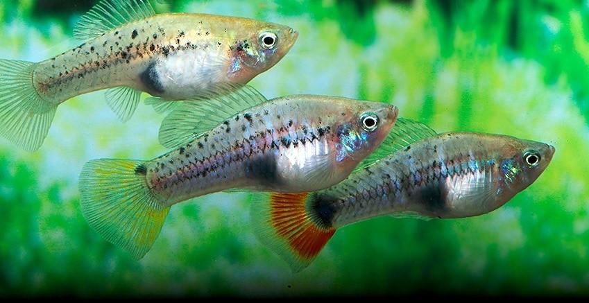 Vor etwa ein halben Jahr hat Aquarium Glaser diese neue Fundort-Variante der Wildform vom Papageienplaty vorgestellt. Nun haben sie von ihrem Züchter die nächste Generation Nachzuchttiere erhalten. Diesmal hatten sie Glück und ein Alpha-Männchen bildete sich schon bei Aquarium Glaser heraus. Als Alpha-Männchen bezeichnet man ein innerhalb der Sozialstruktur einer Tiergruppe das dominante Männchen. Bei Lebendgebärenden Zahnkarpfen gilt ganz allgemein, dass Alpha-Männchen eine vom der Masse der Männchen abweichende Färbung zeigen. Uns gefällt der Alpha so gut, dass wir dir die Xiphophorus variatus Rio Coacuilco hier nochmal zeigen. Die Bilder zeigen das Alpha-Männchen, ein untergeordnetes Männchen (das sich allerdings dem Alpha gegenüber keineswegs unterwürfig zeigt) und ein Weibchen.