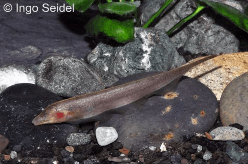 Der Braune Messerfisch (Apteronotus leptorhynchus) ist die Schwesterart des wesentlich bekannteren Weißstirn-Messerfisches (A. albifrons). Aqua Global konnten diese deutlich schlankere und im Gegensatz zu albifrons braun gefärbte Art mit gelbem Rückenstreifen (albifrons ist schwarz mit weißem Rückenstreifen!) nun wieder aus Kolumbien beziehen. Dieser Messerfisch erreicht eine Länge von etwa 27-30 cm und sollte bei 24-29 °C gepflegt werden. Es handelt sich um einen vor allem Dämmerungs- und nächtlich aktiven Bewohner schneller fließender Gewässer. Dem entsprechend ist die Art recht strömungsliebend und sauerstoffbedürftig. Sie kann leicht mit Trocken- und Frostfutter ernährt werden.