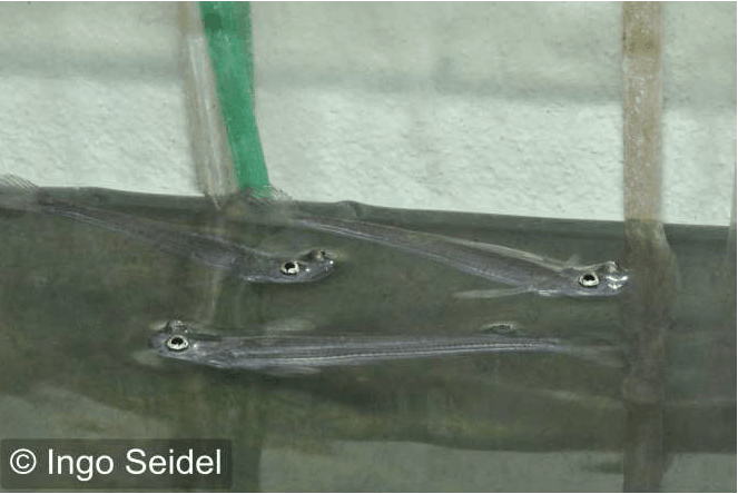 Die Vieraugen (Anableps anableps) gehören zu den Lebendgebärenden Zahnkarpfen. Sie werden aufgrund ihres spektakulären Verhaltens – sie können mit ihren weit vorstehenden Augen sowohl über als auch unter Wasser sehen – gerne in öffentlichen Schauaquarien gepflegt. Aus einem solchen haben wir nun auch einige schöne Nachzuchttiere erhalten. Sie sind allerdings nicht für Jedermann haltbar, denn Vieraugen benötigen aufgrund einer Maximallänge von etwa 30 cm recht geräumige Behältnisse. Sie bewohnen vor allem die brackigen Mündungsbereiche der Flüsse, wo man sie an den schlammigen Ufern sogar an Land beobachten kann. Die geselligen Fische sollten ebenfalls zumindest in einer kleinen Gruppe gepflegt werden. Es handelt sich um etwas scheue Fische, die hervorragend springen können.