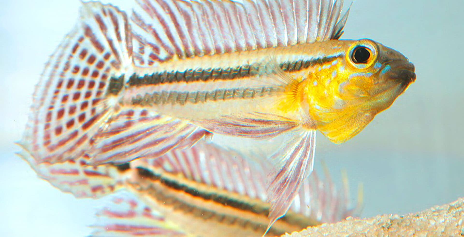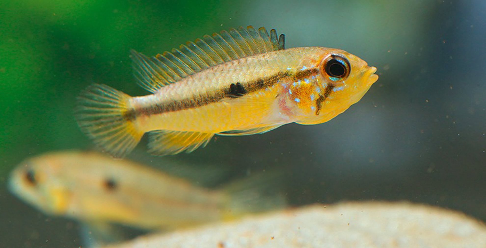 Apistogramma bitaeniata ist ein typischer Höhlenbrüter. Während das gelb gefärbte Weibchen sich um Laich und Jungfische kümmert, verteidigt das Männchen das Revier seines kleinen Harems.