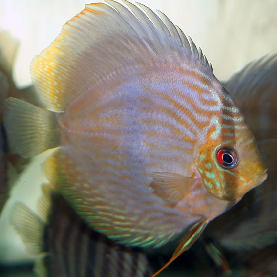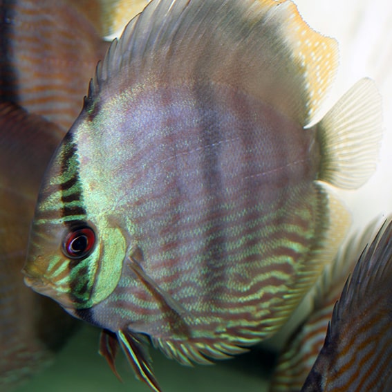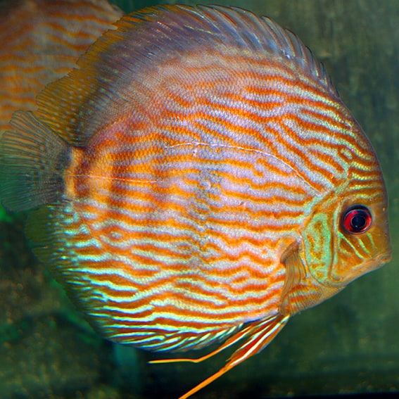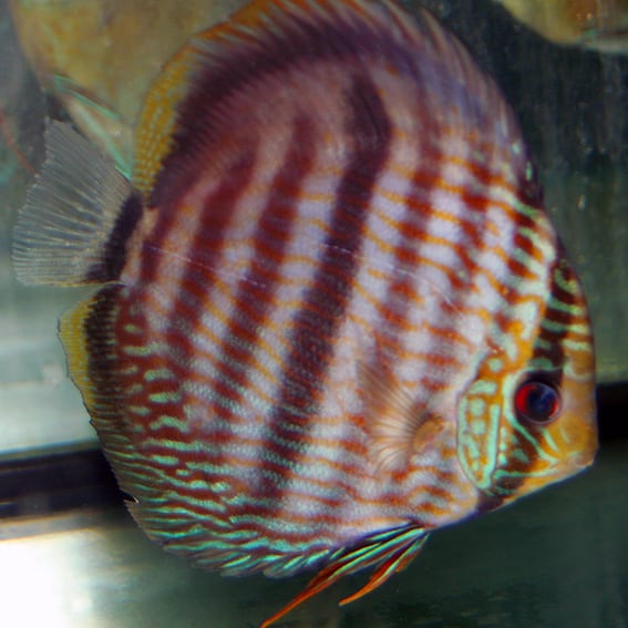 Dieser sehr schöne Heckel-Discus stammt aus dem Uatuma. Die Färbung der Tiere variiert individuell sehr stark, allen gemeinsam ist der hohe Blauanteil in der Farbe der waagerechten Streifen. Es gibt auch Blaukopfheckel unter den Tieren!