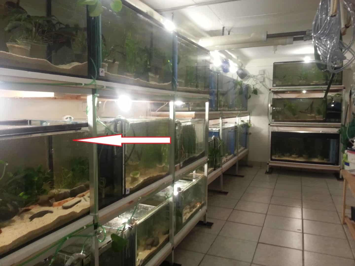 Als potentielle Laichplätze und Unterstände wurden verschiedene Höhlen eingebracht, teilweise vom Bodengrund verdeckt. Da wir bisher nichts über das Fortpflanzungsverhalten der Art wissen, wurden verschiedene Größen und Formate eingebracht (rund, länglich, einseitig bzw. zweiseitig offen, etc.). Der Bodengrund besteht aus gewaschenem Sand.