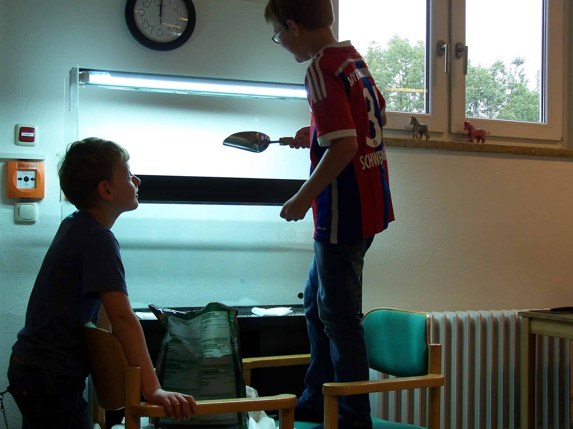 Bernd: „Welche Farbe wünscht Ihr euch für die Fische?“ Die Kinder: „Rot und Gold!!!“ Volltreffer!