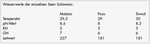 Wer zu weiches Wasser hat, zum Beispiel unsere Ostfriesen, die meist auf Torf wohnen, müssen mit der gleichen Berechnung ihr Wasser mit aufgehärtetem Wasser vermischen. Zur Aufhärtung eignet sich Osmosesalz, bei dem die GH stärker angehoben wird als die KH. JBL bietet mit JBL AquaDur ein solches Salz an. Steigen wir noch ein wenig weiter in die spezielle Wasserchemie der Sulawesi-Seen ein: Der Towuti-See zum Beispiel besitzt eine GH von 6, eine KH von 5 und eine Leitfähigkeit von 181 μS/cm. Bei normaler Ionenverteilung entsprechen 30 μS/cm etwa einem Grad Gesamthärte. Teilt man somit 181 : 30, so erhält man die theoretische Gesamthärte, hier 6. Da sechs auch die wirkliche Härte des Sees ist, kann man ableiten, dass das Verhältnis von Kalzium zu Magnesium nicht ungewöhnlich ist. Hier sei der Tanganjikasee als Gegenbeispiel genannt, der mit 10°dGH, 18°dKH und 650 μS/cm völlig andere Werte aufweist. Teilt man hier 650 : 30, erhält man 21. Bei normaler Ionenverteilung müsste der Tanganjikasee somit eine GH von 21 besitzen. Hat er aber nicht, sondern nur 10°dGH. Diese zeigt auf den ersten Blick, dass hier besondere Wasserverhältnisse vorliegen. In diesem Fall übrigens durch Natriumbikarbonate ausgelöst, die die KH in die Höhe treiben, ohne die GH zu erhöhen, da das Natrium nicht zur Gesamthärte gerechnet wird. Das ist nun wirklich keine leichte Kost mehr und nur für an der Wasserchemie Interessierte spannend. Für den Normalsterblichen ist wichtig, dass er am Wasser nicht noch mehr herumfummeln muss. Ein mittelhartes Wasser und 28 bis 30°C, und die Sache stimmt.