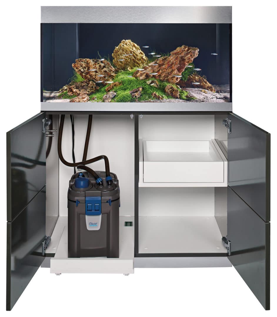 Für größere Aquarien ist oft ein leistungsfähigerer Außenfilter das Mittel der Wahl. Er zeichnet sich in der Regel durch ein im Vergleich zum Innenfilter höheres Filtervolumen aus. Oft kommen verschiedene Filtermaterialien gleichzeitig zum Einsatz. Im Unterschrank oder daneben platziert, bleibt der Platz im Tank ganz Tieren und Pflanzen vorbehalten. Auch die freie Sicht auf die Unterwasserwelt wird durch die Technik nicht gestört. In Kauf nimmt man das größere Risiko eines Wasserschadens, nachdem das Wasser zur Reinigung aus dem Becken herausgeführt wird. Achten sollte man daher auf einen Absperrmechanismus und eine Sicherheitsverriegelung, wie sie etwa im Oase BioMaster zu finden sind. Sie minimieren die Gefahr, dass Wasser austreten kann, etwa bei Entnahme des Vorfiltermoduls. Gereinigt werden muss ein Außenfilter nur vergleichsweise selten. Die Reinigung der Filtermaterialien und Schläuche ist dann jedoch aufwendiger als bei innen liegenden Modellen.