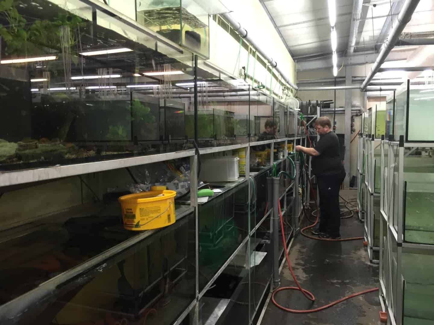 Habt ihr euch einen Großhandel so vorgestellt? Aufgrund der Hygiene und Pflege ist hier einiges anders als im gestalteten Aquarium zu Hause. Nur so können die Gesundheit und Qualität der Tiere gewährleistet werden. Die rund 34 Mitarbeiter kümmern sich täglich um die Tiere. Auch an Futter und großen Wasserwechseln fehlt es hier nicht!