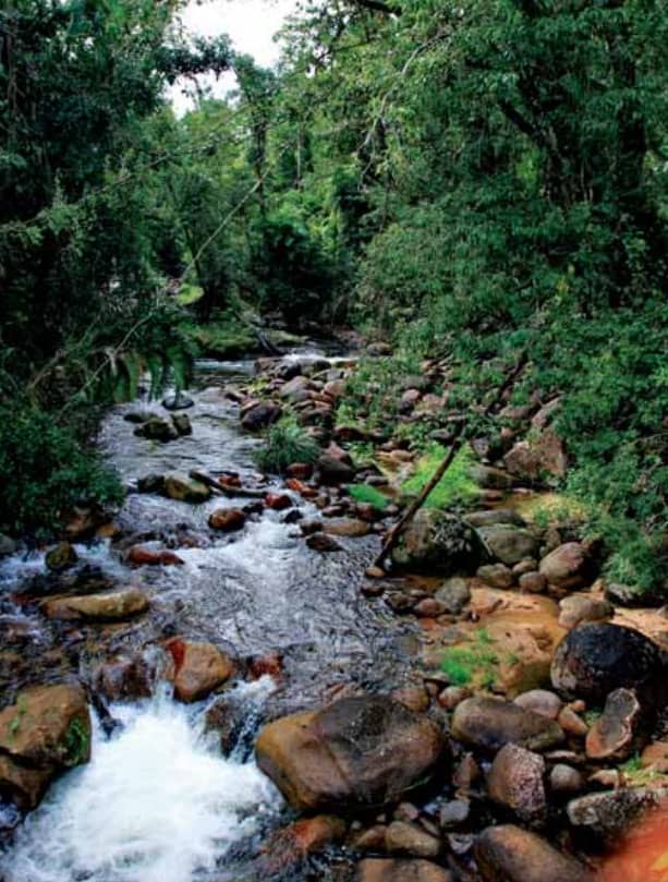Das Habitat bestand aus einem wunderschönen Bach, der durch die vielen Wasserfälle einen äußerst hohen Sauerstoffgehalt aufwies. Das Wasser hatte lediglich eine elektrische Leitfähigkeit von 34 µS/cm und der Bachboden war bedeckt mit Blättern, von denen sich die unzähligen Garnelen ernährten. Darüber hinaus geben die Blätter Huminstoffe ab, die das Wasser bersteinfarben machen und den pH-Wert auf 4,8 senken. Die hohe Populationsdichte der Tiere lässt sich durch das Fehlen von Fressfeinden erklären, denn in Bachabschnitten mit Räubern wie Scherengarnelen oder Regenbogenfischen, fand ich nicht eine einzige Dschungel-Black-Bee. Das war bei dieser auffälligen Färbung auch nicht verwunderlich. Dennoch wäre denkbar, dass die Färbung aus evolutionsbiologischen Gesichtspunkten eine günstige Tarnung gegenüber den Vögeln des Regenwaldes darstellt. Die zwei charakteristischen Streifen könnten der Garnele helfen, im Bach zwischen den vielen sich bewegenden Schatten optisch zu verschwinden. Durch die Urwaldriesen, die über den Bach ragen, kommen immer nur „Lichtportionen“ im Wasser an.