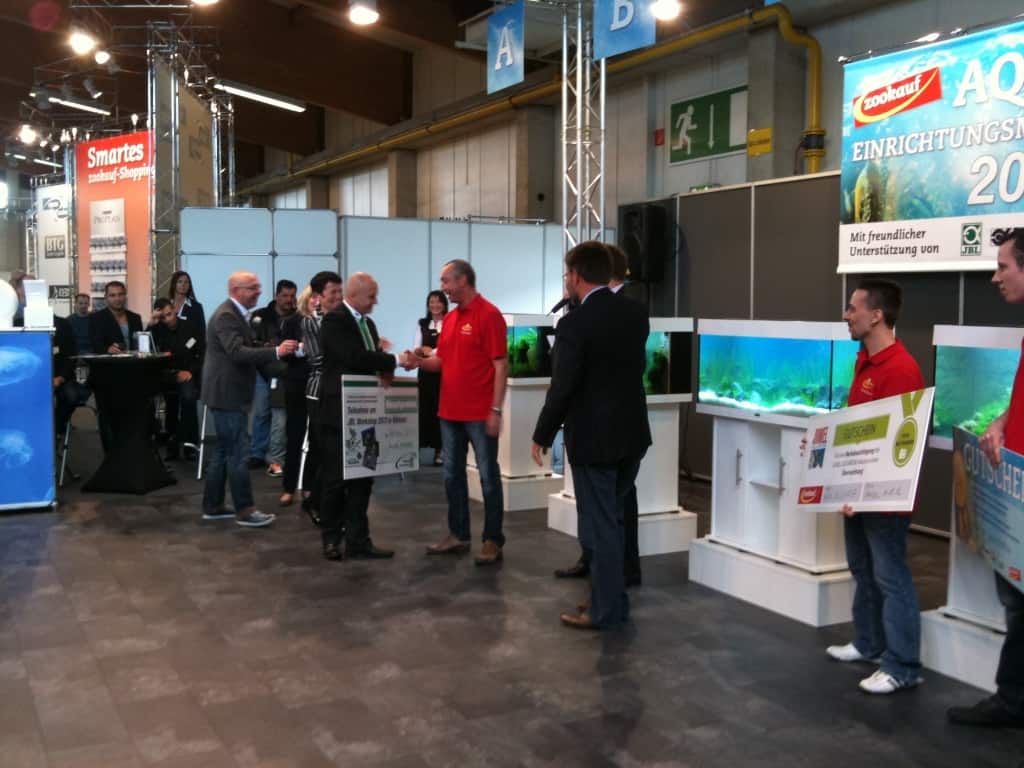 Auf dem fünften Platz landete Dominik Brandt (Olympia Zoo), Platz vier sicherte sich Sascha Osterloh (Zoo21, Friesoythe), auf den dritten Platz gelangte Klaus Kucharz (Zoohaus Haindl) und auf den zweiten Platz schaffte es Michael Carboni (Tierbedarf Meyer Schweinfurt). Über einen herausragenden ersten Platz freute sich ein überraschter und überglücklicher Andreas Barth (Zoo Käppner, Egelsbach). „Ich weiß gar nicht, was ich sagen soll“, meinte der Sieger, der nun an einer durch die Firma JBL gesponserten Vietnam-Expedition teilnehmen darf. Die weiteren vier Gewinner erhielten ebenfalls hochwertige Preise wie eine Exklusiv-Führung durch die Gewächshäuser der Firma Dennerle inklusive Übernachtung (Platz zwei) oder einen Besuch der Firma Juwel Aquarium mit Einblicken in die Produktion (dritter Platz). Hinzu kamen Eintrittskarten für das Reptilium Landau (Platz vier) sowie einen der deutschen „Sealife Aquarium“-Standorte (Platz fünf). Die Messebesucher konnten ebenfalls etwas gewinnen: Aus den rund 200 abgegebenen Stimmkarten zog die Glücksfee die Zoofachgeschäfte Schnalke Aquaristik, Tierbedarf Meyer und Family Zoo.